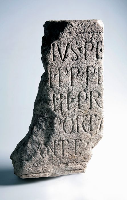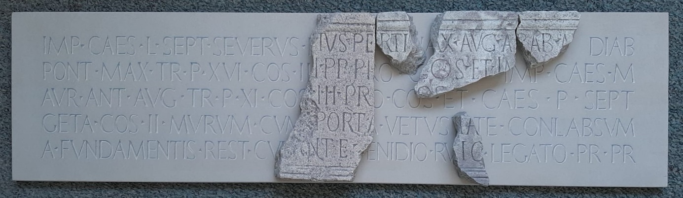 Op deze grote kalkstenen plaat is een verbouwing aan het stenen fort vastgelegd, die tussen het jaar 208 en 211 is uitgevoerd. Uit de tekst blijkt dat de muur met poort –door ouderdom was ingestort en vanaf de fundamenten is hersteld–. Dat is tijdens het keizerschap van Septimius Severus gebeurd.