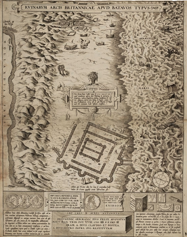 Op prenten van de Brittenburg is een gebouw met zware fundamenten te zien. Het bestaat uit twee delen, is verstevigd met steunberen en omgeven door een muur.