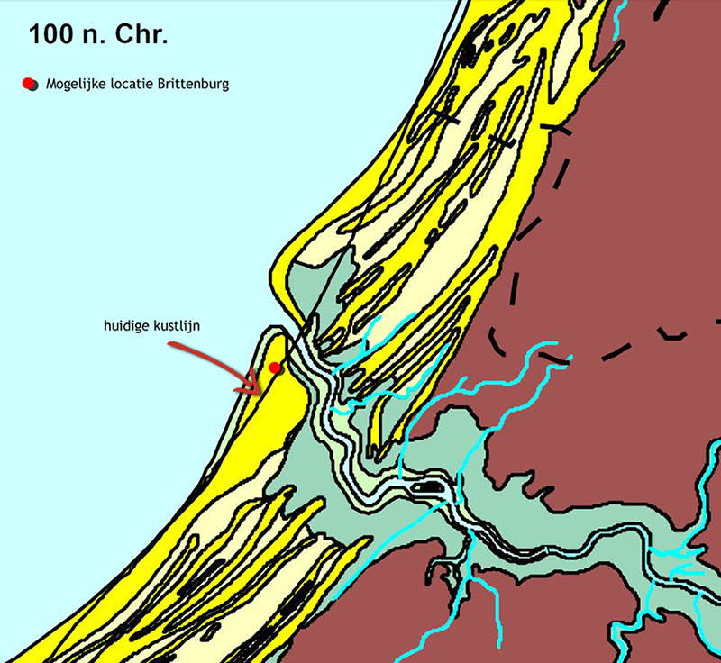 In de loop van bijna 2000 jaar heeft de kust zich over een grote afstand in oostelijke richting teruggetrokken. In de Romeinse tijd lag de zee zo’n 400 tot 500 meter verder naar het westen. In de 16de en de 17de eeuw bevond de kustlijn zich ca. 100 meter ten westen van de huidige kustlijn. De resten van de Brittenburg waren toen nog bij extreem laag water zichtbaar. En nu ligt de plek waar de Brittenburg kan worden gesitueerd dus ergens in zee.