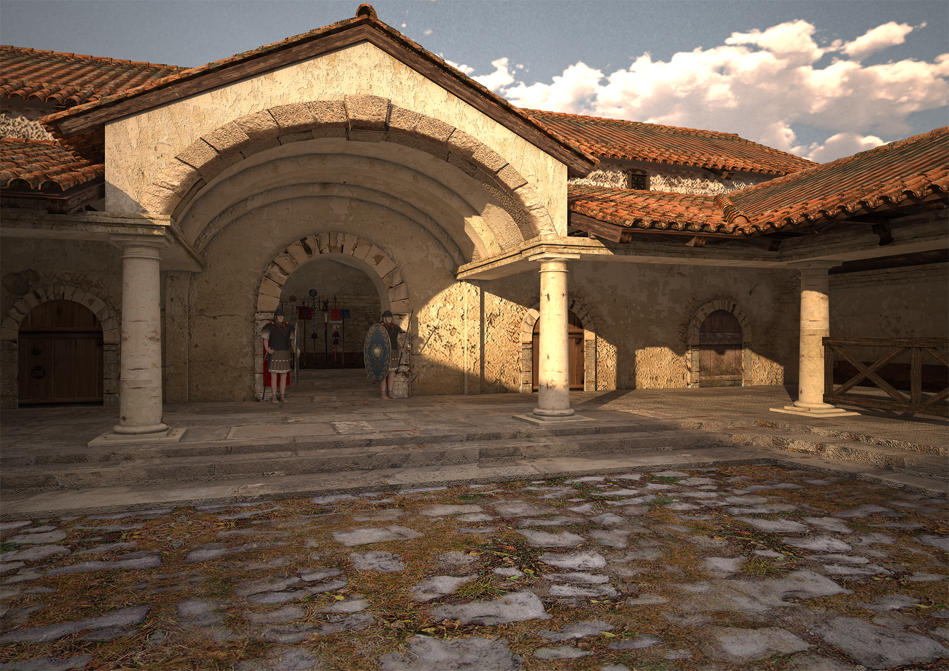 Het belangrijkste gebouw in het fort was het hoofdkwartier, de principia, op het kruispunt van de twee rechte wegen door het castellum. Bij binnenkomst kwam