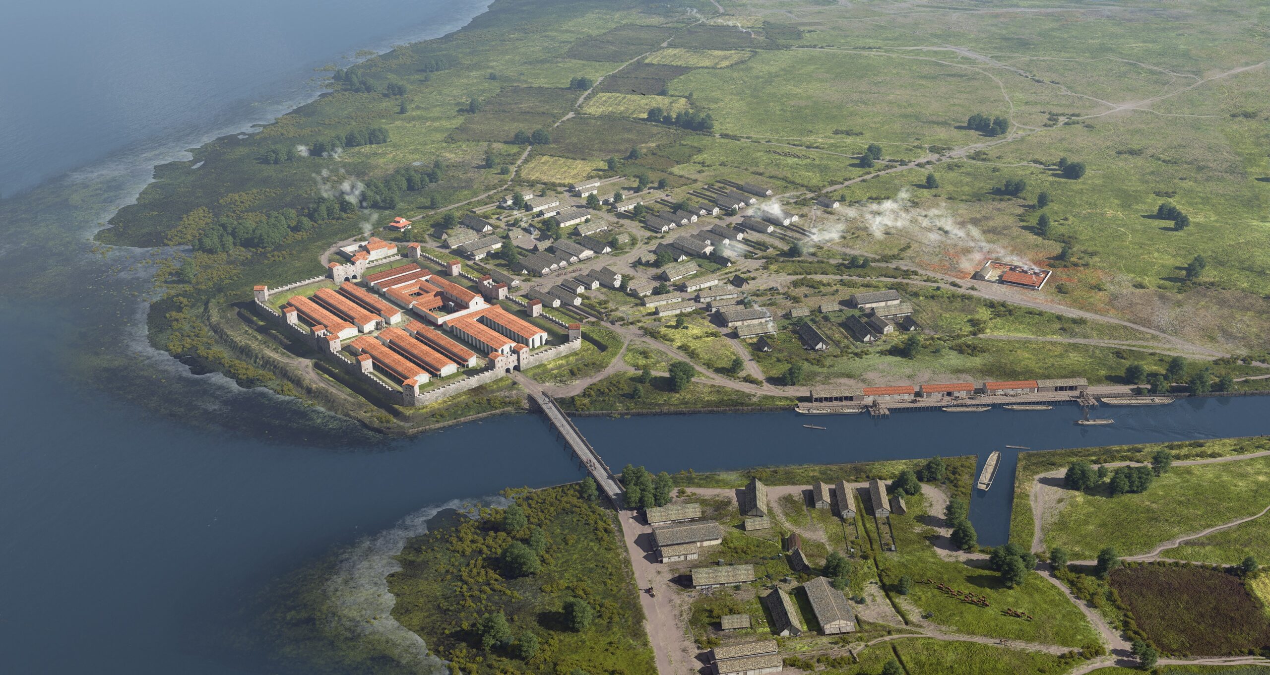 Hier kijk je uit over het Kanaal van Corbulo. Aan deze kant van het kanaal lag een haven met losplaats. Tijdens opgravingen zijn houten beschoeiingen
