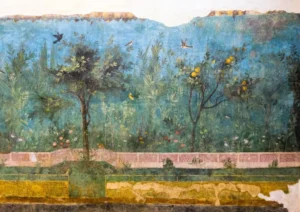 Afbeelding: fresco van een Romeinse tuin uit Pompeï.